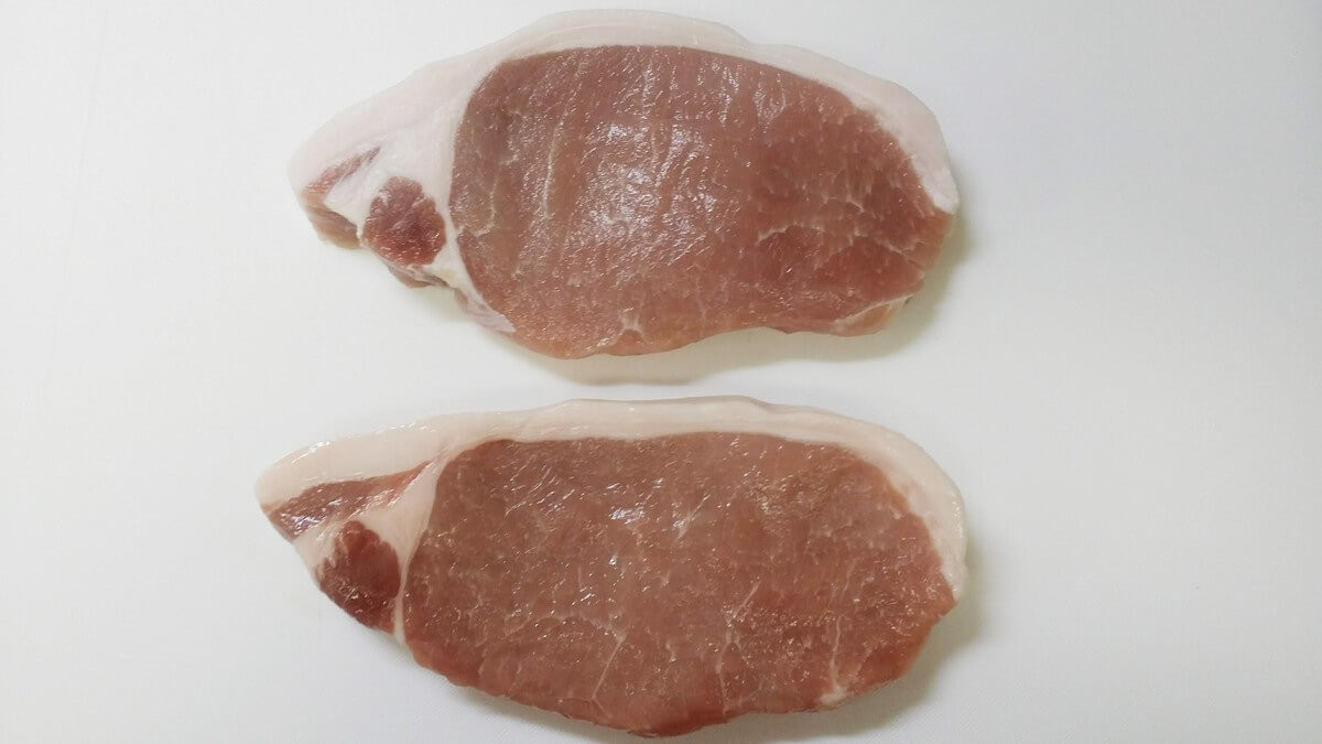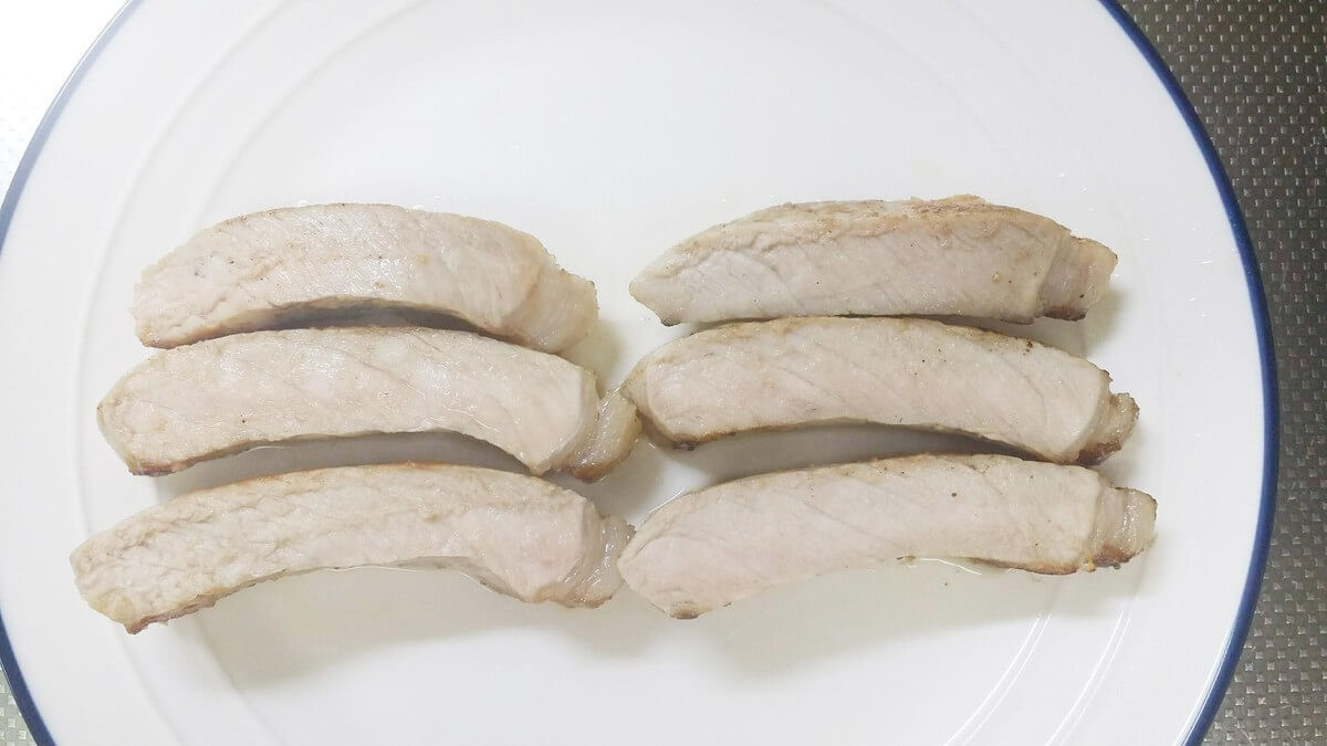 次は豚肉です。こちらもブライン液に4時間浸けました。上のがブライン液に浸けた肉なのですが、鶏むね肉と同じように、浸けてない肉と比べても見た目に違いはありませんでした。こちらも焼いて比べてみます。