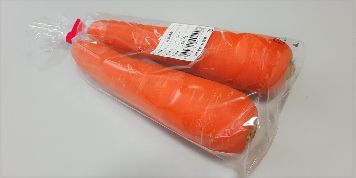 まずは人参。 1本15cm以上の大きめサイズが2本で100円!産地は北海道です。