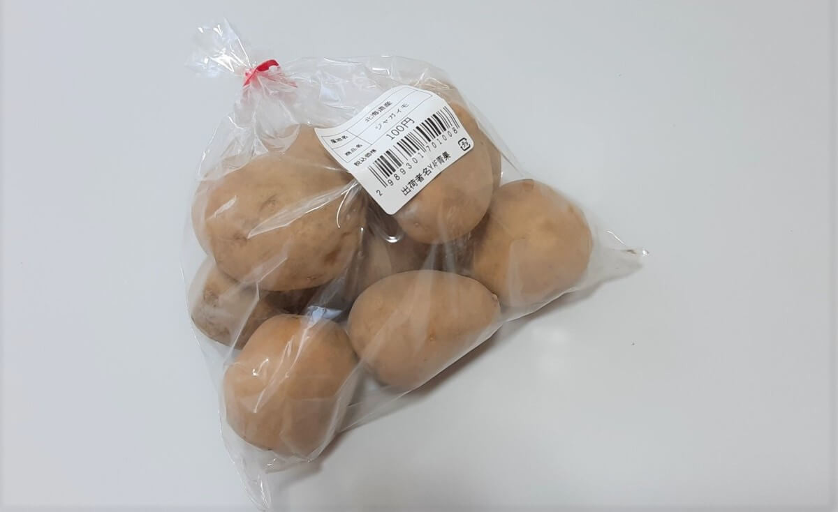 北海道産のじゃがいもが一袋にゴロゴロ8個入って100円です。 料理につかうのはもちろん、洗ってレンジでチンして食べるのもいいですよね。