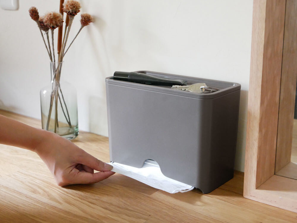 人気のマスクディスペンサーから、天面がトレイとして使えるもっと便利な「NEWマスクディスペンサー」の登場です。トレイには鍵や印鑑、体温計など必要な物をまとめて置ける、暮らしにとけこむマスクの収納ケースです。