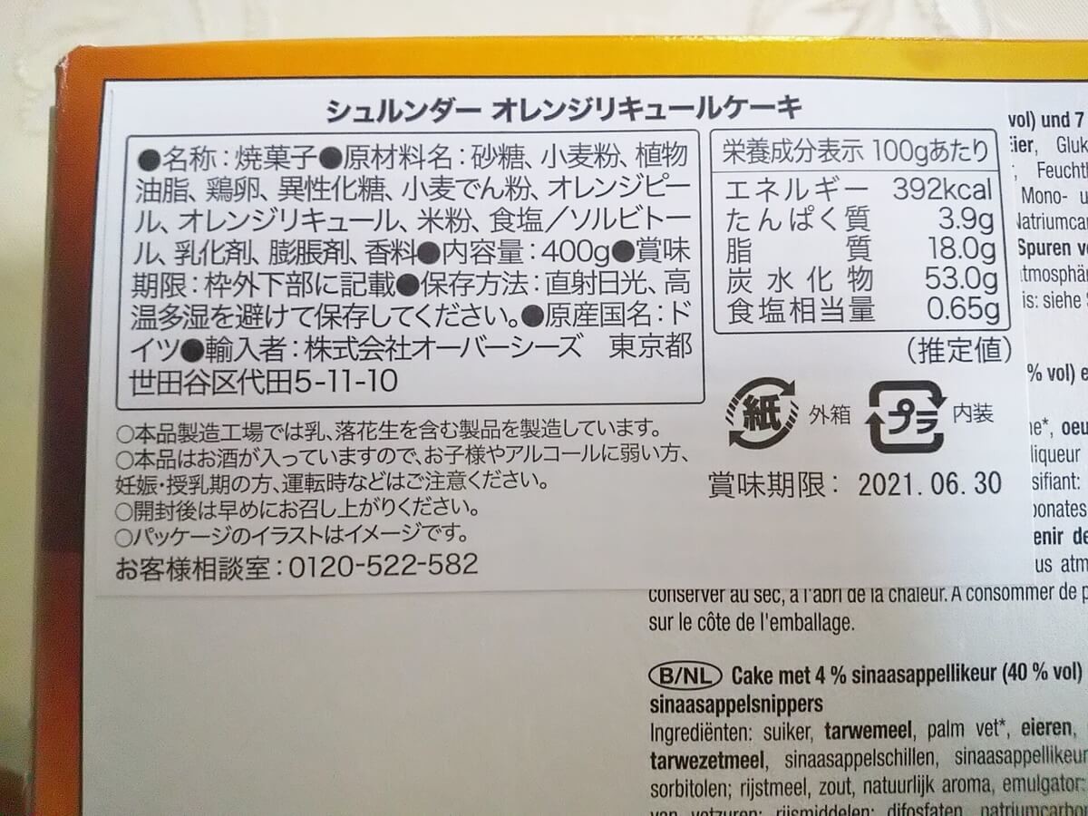 上品サイズのケーキじゃ物足りない!という人におすすめなのがこちら。 コアントロー(オレンジのリキュール)が使われた、ドイツのシュルンダー社のケーキ。内容量は400g(!)もあり、手に取るとズッシリ感があります。