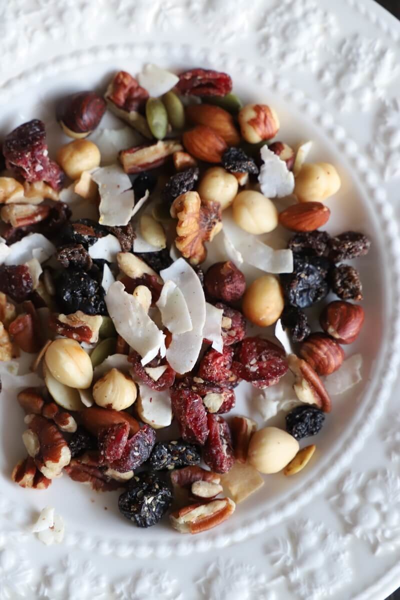 原材料を見ると、「アーモンド、ペカンナッツ、くるみ、ヘーゼルナッツ、ココナッツ、タルトチェリー加工品、クランベリー加工品、レーズン、かぼちゃの種、ひまわりの種」の、10種類のナッツやフルーツがはいっており、味付けは塩のみ。シンプルです!
