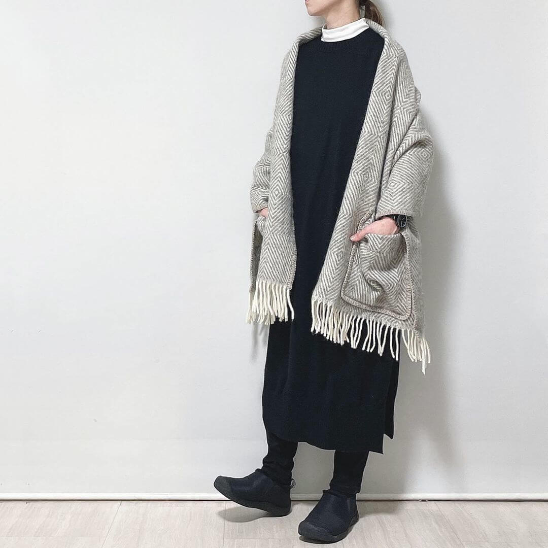 黒のノースリニットワンピからのぞく、首もとの白でクリーンさをプラス。