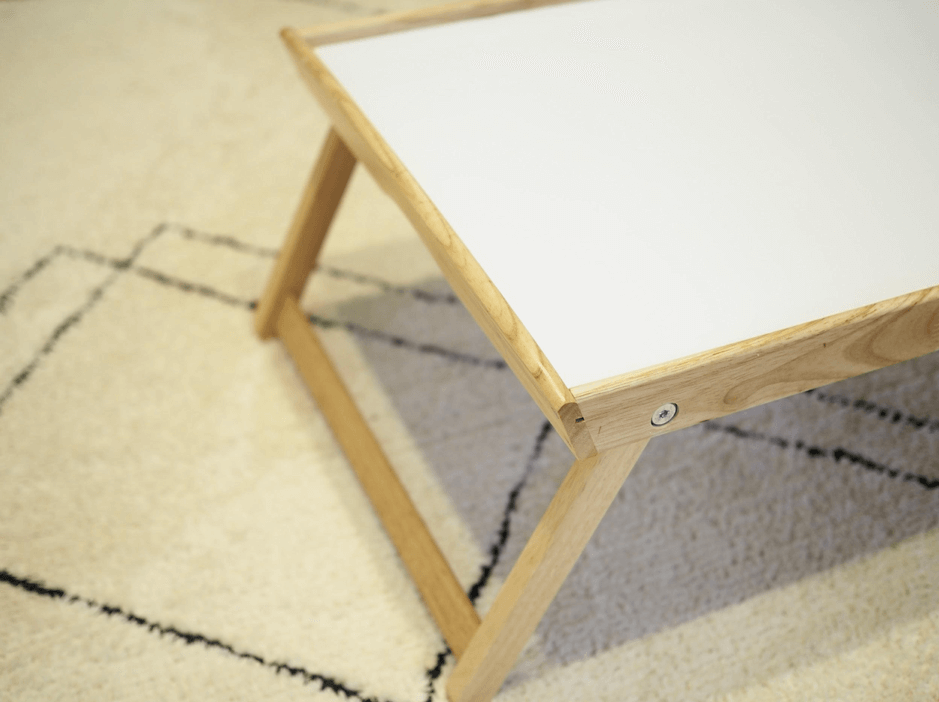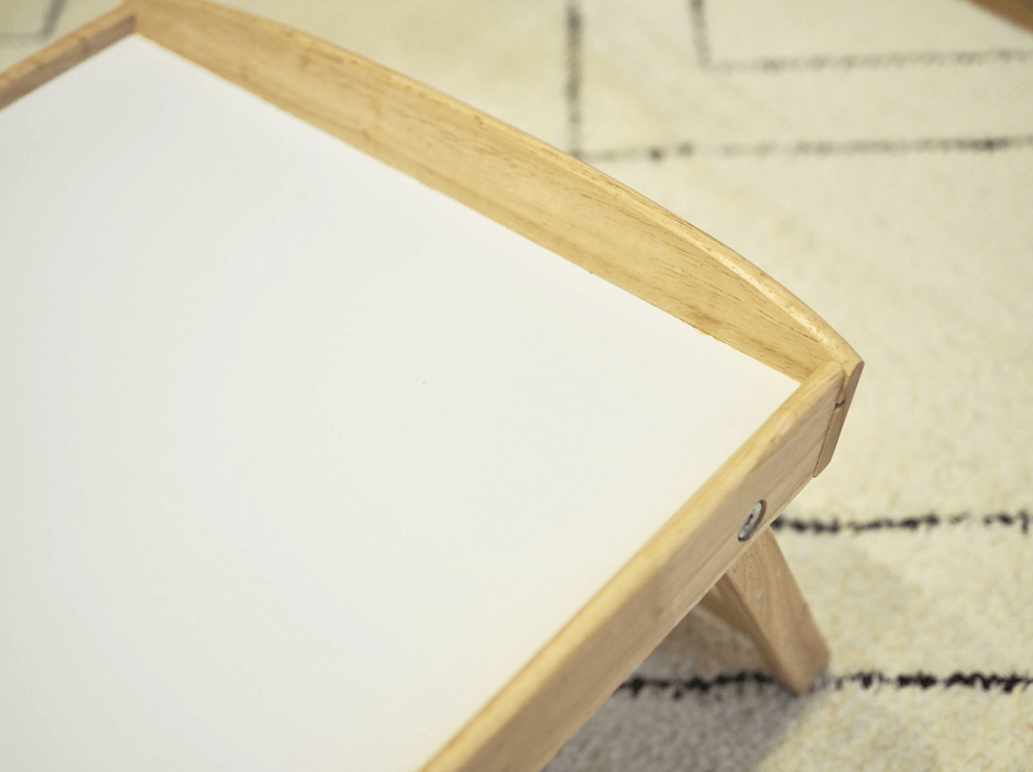 トレイというだけあって、テーブルの縁が立ち上がったデザインが特徴。飲み物をこぼしてしまっても、床を汚さないため安心です。