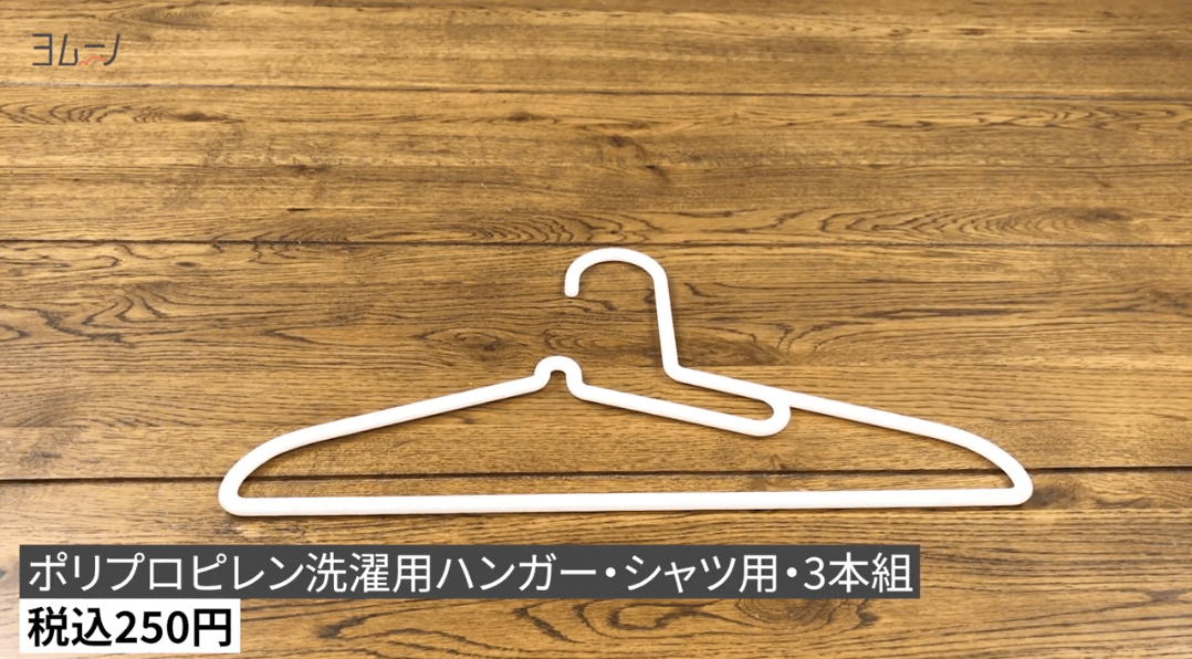 - 無印良品「ポリプロピレン洗濯用ハンガー・シャツ用・3本組 約幅41cm」250円(税込)