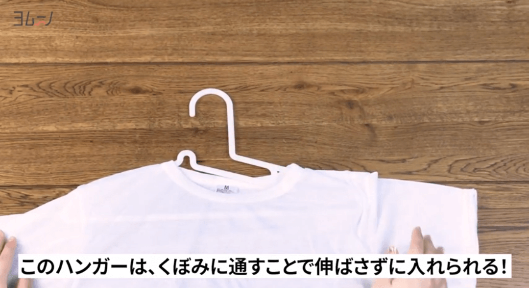 通常のハンガーだと、首元からハンガーを入れると首まわりが伸びてしまいがち。 けれども、この〝くぼみ〟に通すことで伸ばさずに入れることができるので大変便利です。