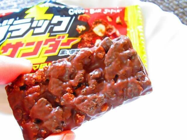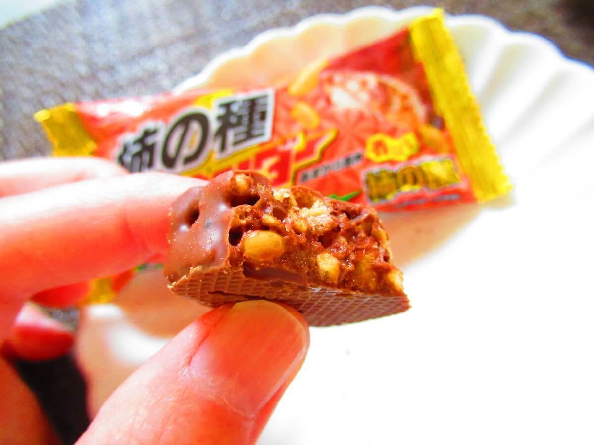 ブラックサンダー「柿の種」バージョンということで興味深々で食べてみると……砕いた柿の種がときどき出てきて、ザクザクの食感と甘じょっばさがくせになります。