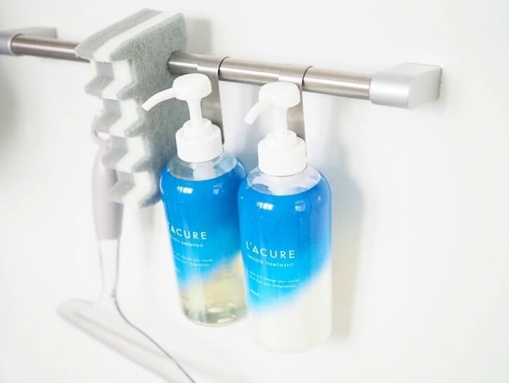 シャンプーやコンディショナーのボトルに付けておくと吊り下げ収納ができるので、ボトル底のいやなヌメリ掃除から解放されますよ♪