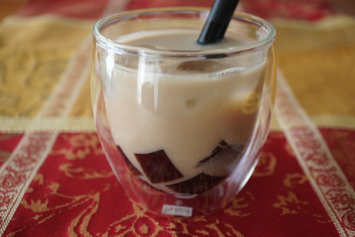 仙草ゼリーの苦みと漢方のような風味がミルクティーととても相性が良く、ミルクティーにコクが増します。