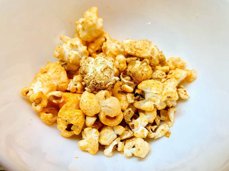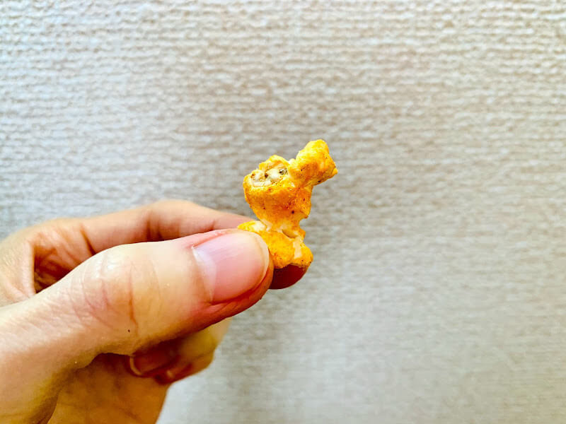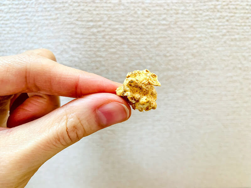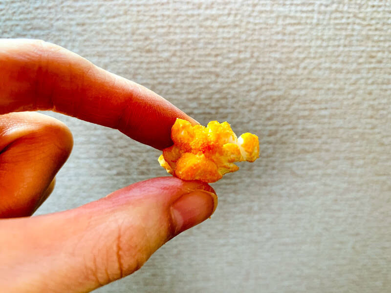 カレー味。本格的だなぁと感じたのは、ポップコーンを黄色に染めているのではなく、茶色いスパイスがたくさんかかった見た目なこと。カレーのお菓子=黄色って、ある意味刷り込みかもしれませんね。