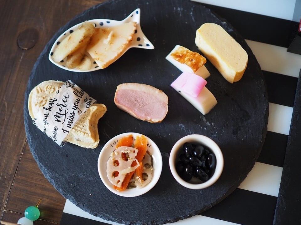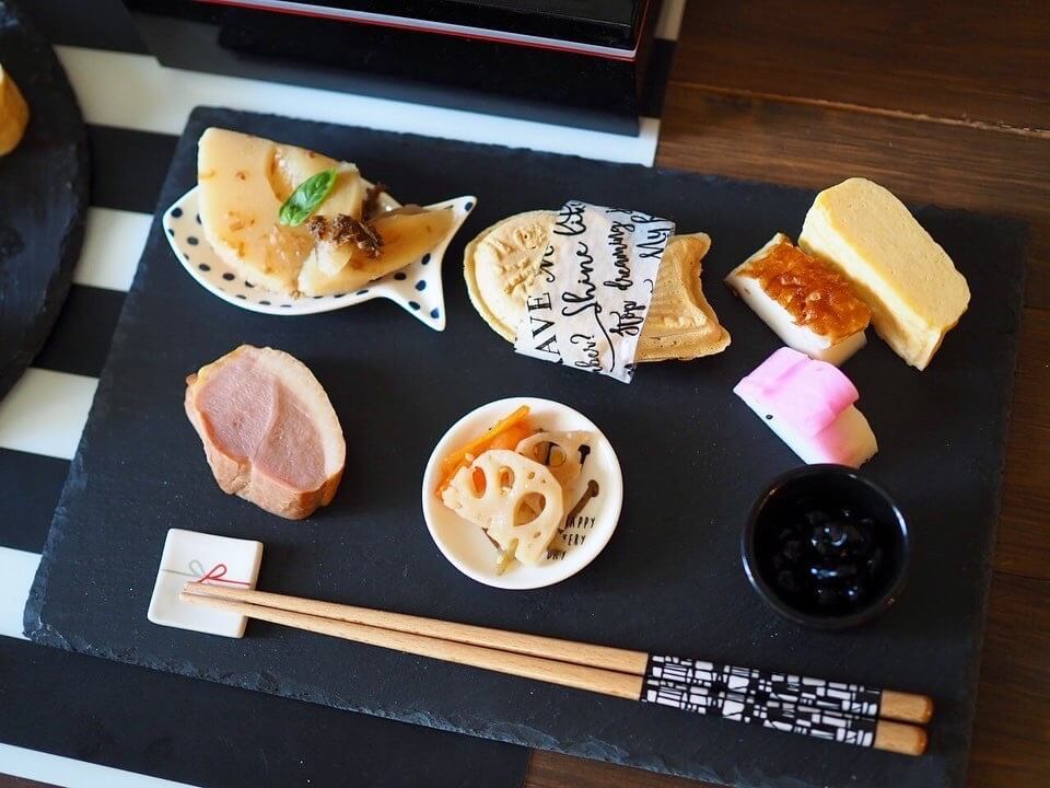 おせち料理は、ダイソーやニトリなどで500円前後で購入できるスレートプレートに盛り付けて、ワンプレートおせちにすると上品な印象に。