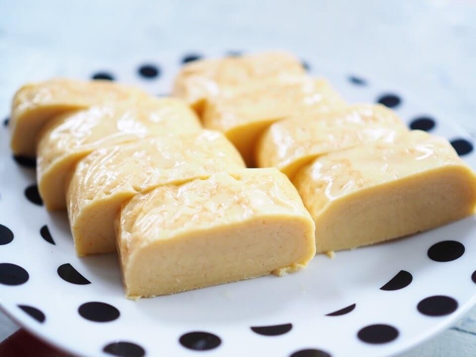 カットしてみると、とてもきれいなだし巻きです。自分で作るとうまく巻けなかったり焦げ目がつきすぎてしまったり難易度の高いだし巻きも、カットするだけなのでとてもお手軽です。