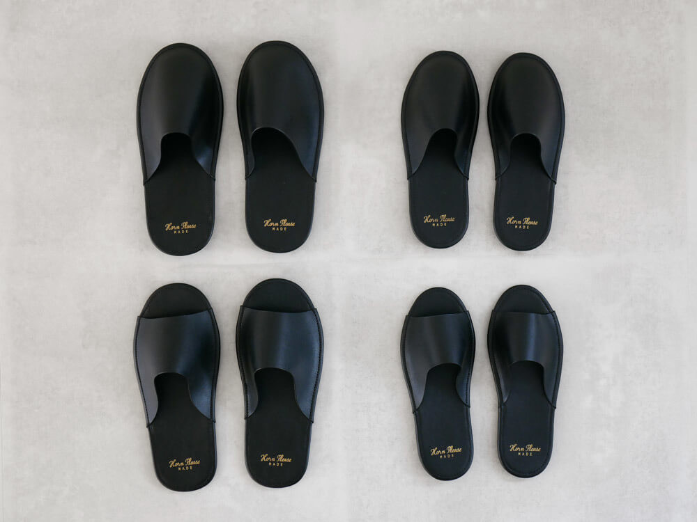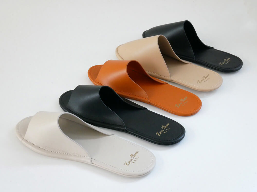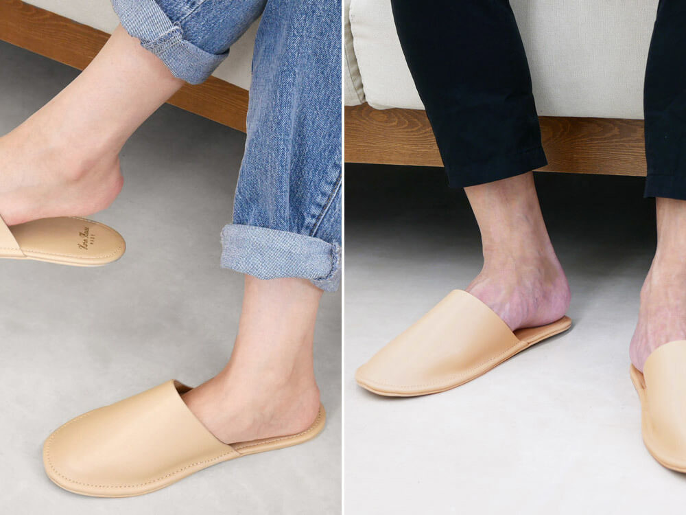 どんなインテリアにも合わせやすい2タイプのシンプルなデザインと、上品なカラーで年齢性別問わずお使いいただける「スリッパ ヴィーガンレザー」はプレゼントにもおすすめですよ。