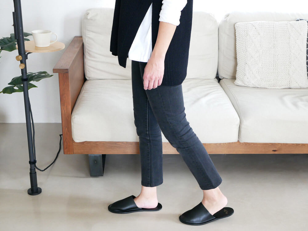 だからこそ、履き心地や足運びのしやすさにはこだわりが強いのですが、「スリッパ ヴィーガンレザー」は、履いた瞬間から「あれ、もう馴染み始めてる?」なんて感じるくらい、優しく包みこまれるような履き心地のスリッパでした。