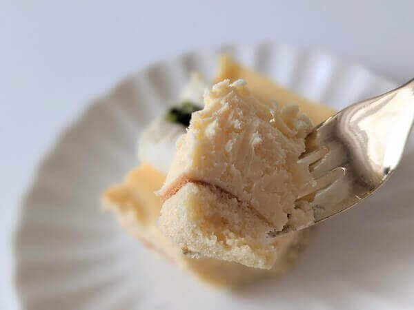 思ったよりもしっとり感があり、ふわっとした食感。成城石井の「スフレチーズケーキ」はフォークで簡単に切れますので、お子さんに取り分ける時には便利だったそうですよ。その反面、形が崩れやすいとのこと。