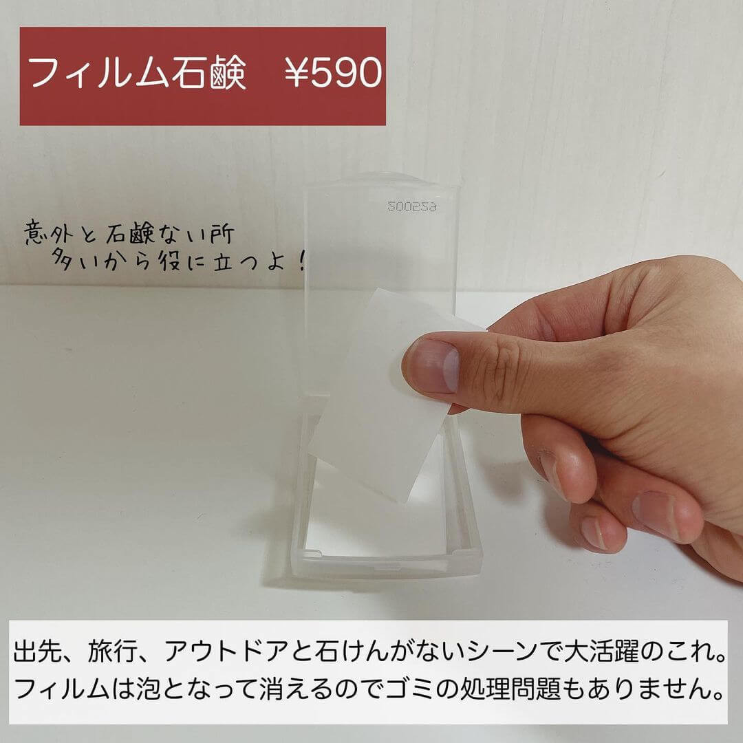 カバンに入れておくと便利な無印アイテムをゲットした@maru.mujiさん。その中でもいざという時の外出先やキャンプ先などで持ち運び可能なフィルム石鹸!