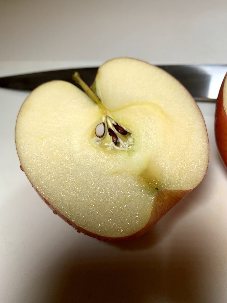 種をくり抜くのとバターを乗せやすくするため、りんごは半分に切ります。