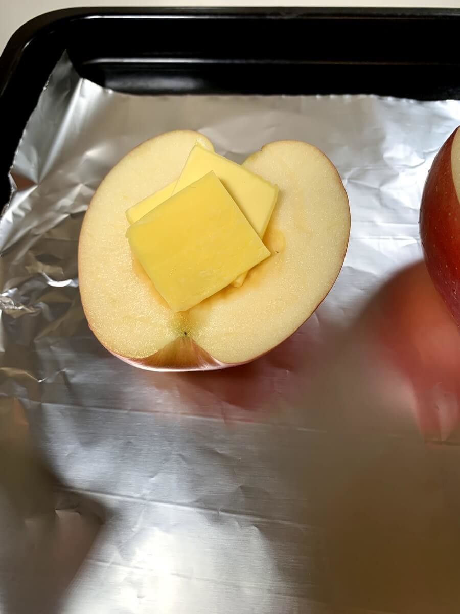 りんごを半分に切り、バターをのせるだけ。焼く時間をのぞいたら5分もかかっていません。作るのが簡単なのに、かなり美味しくて驚きました。