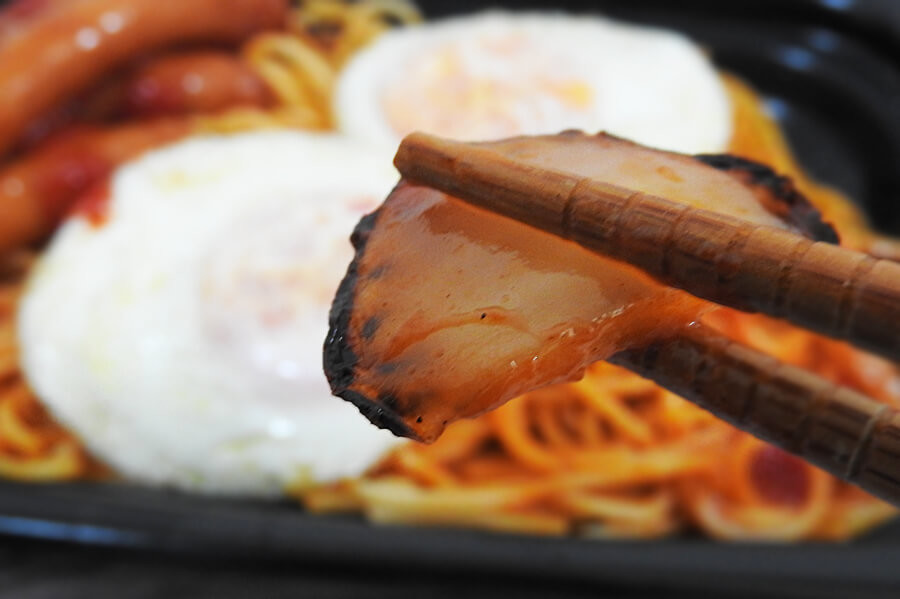 ナポリタンを食べ進めていくと、焦げ目がついた玉ねぎが入っていました。玉ねぎが入っている量はごくわずかで存在感はほとんどなし。ナポリタンを食べていても、途中まで玉ねぎが入っていることに気が付かないほどでした。