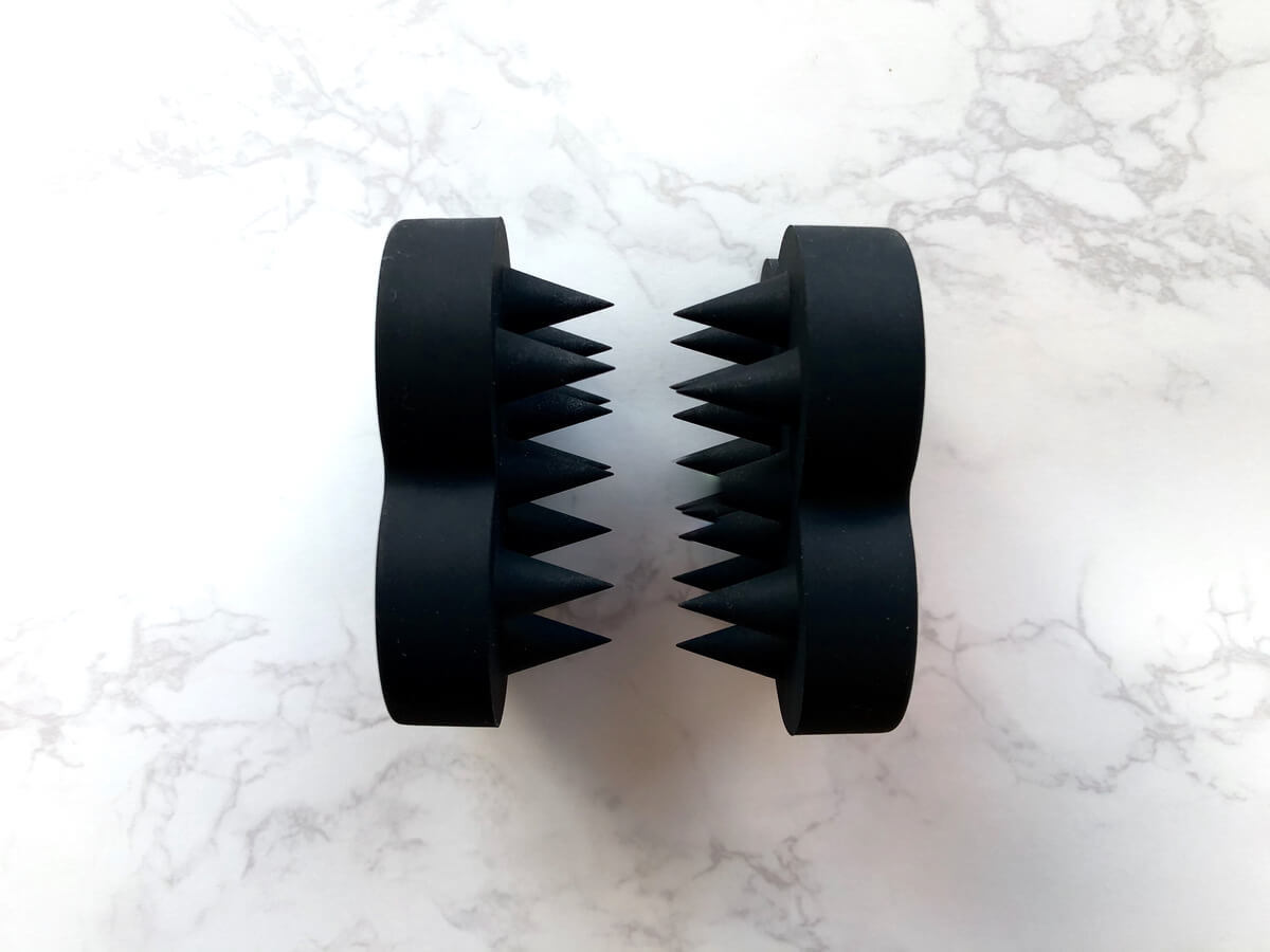 生け花で使われる剣山のような、ギザギザとした見た目がとても特徴的なスカルプブラシ。シリコーン製なので頭皮に突起部分をあてても痛みを感じません。