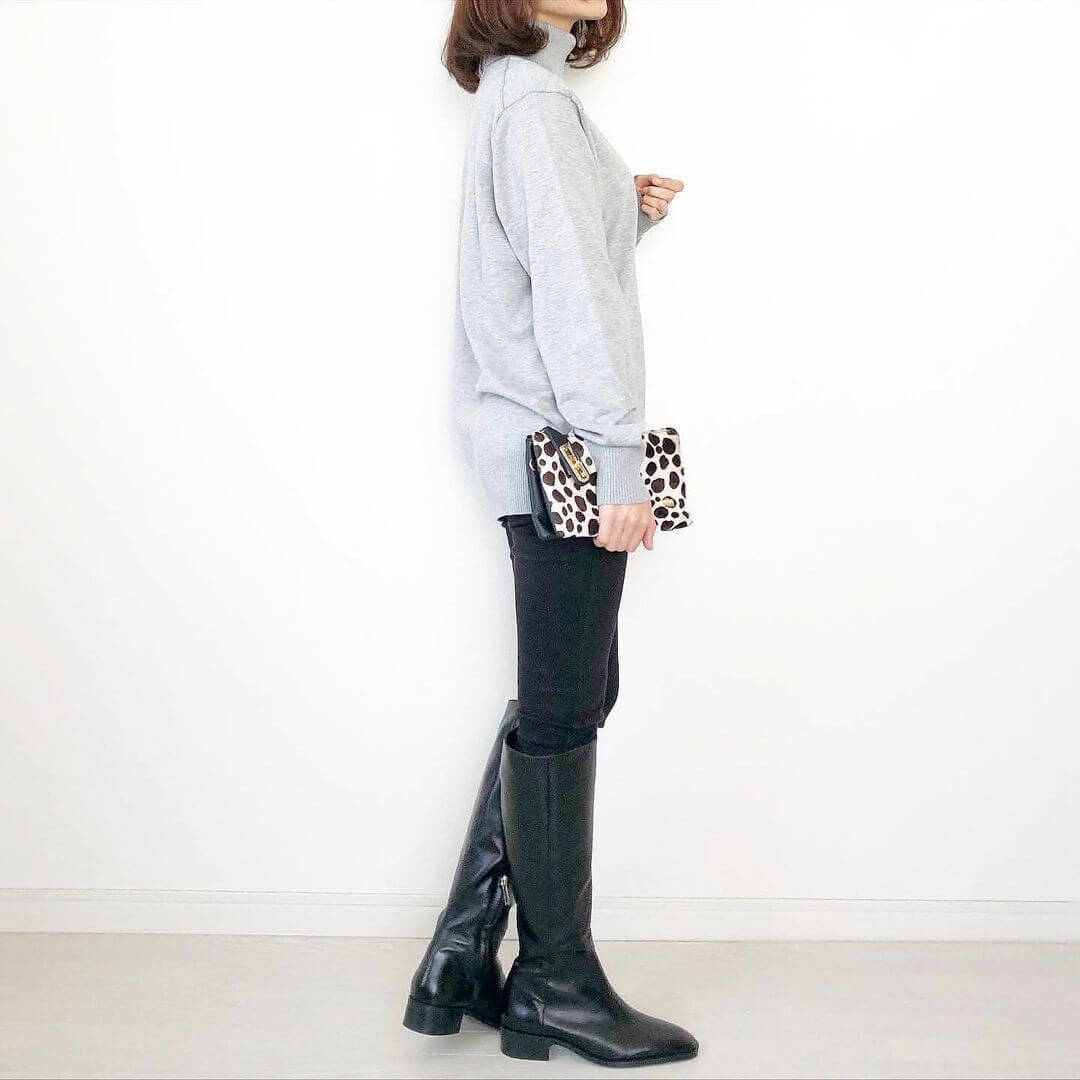 グレーのタートルニットには、黒のロングブーツに、ダルメシアン小物をアクセントに。
