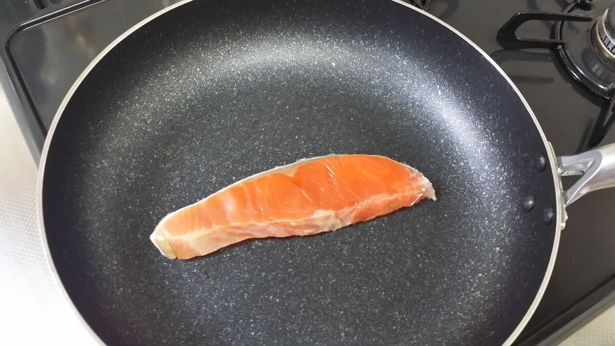 フライパン+シートなしで焼き魚①直接、フライパンに鮭を並べる