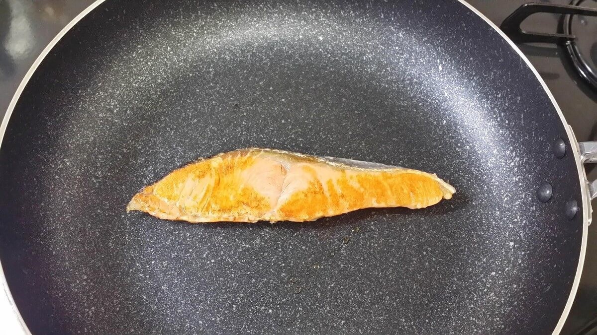 フライパン+シートなしで焼き魚②鮭を片面3分ずつ焼く