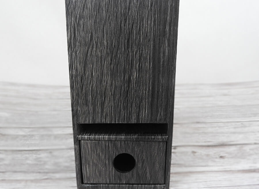 ファイルスタンド内のモノを取り出す時に長方形の穴から指を入れてモノを押すと、ファイル内のモノの取り出しがしやすい……といった意味合いでしょうか。あるいは湿気対策なのかもしれませんが、長方形の穴があったらあったで便利ではあります。