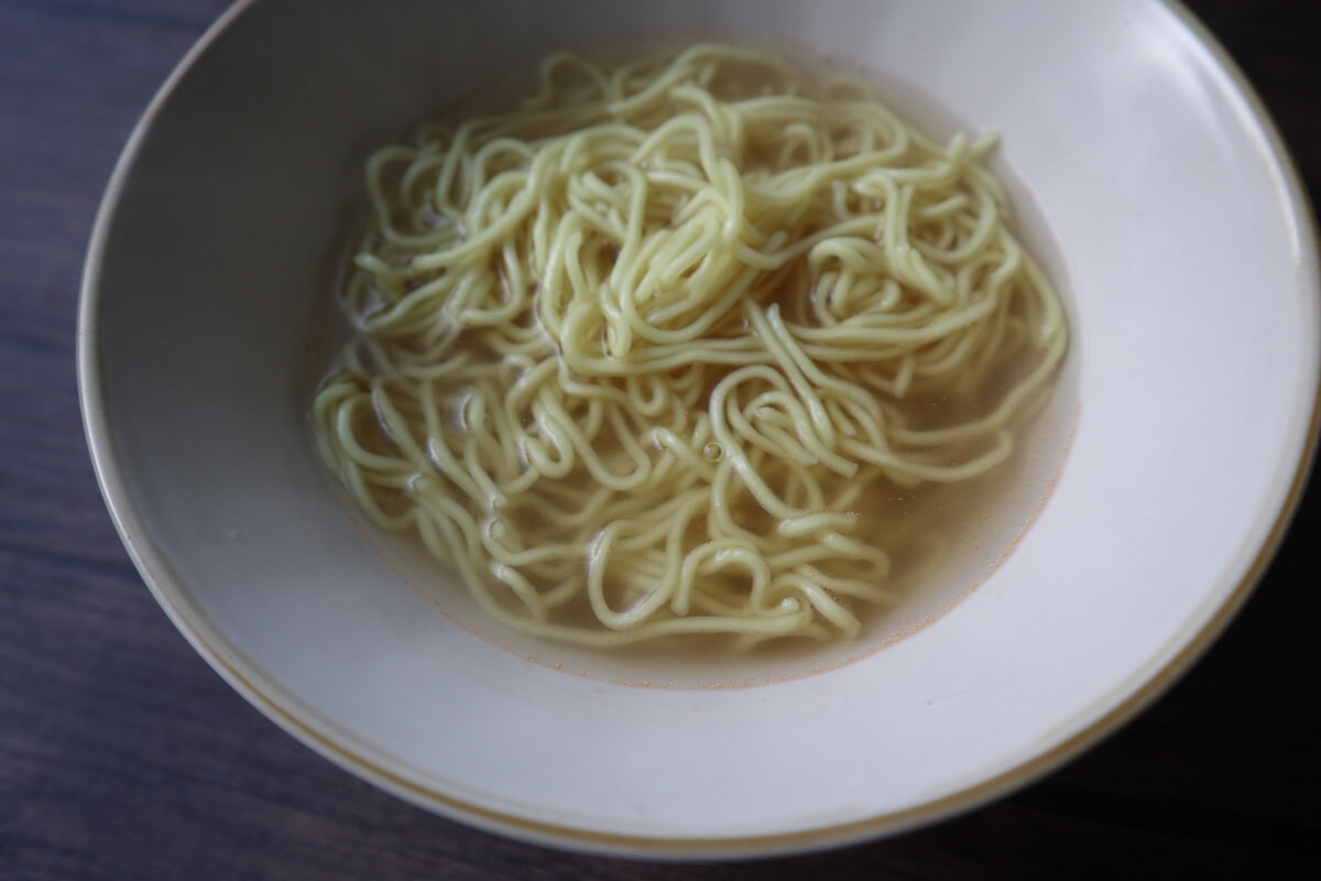 器にスープをあけて、熱湯240mlを注ぎよく溶かします。そこへ麺を入れます。
