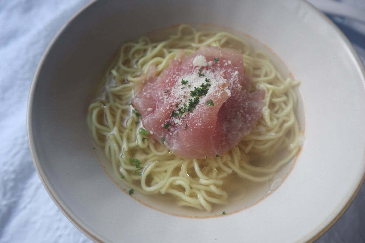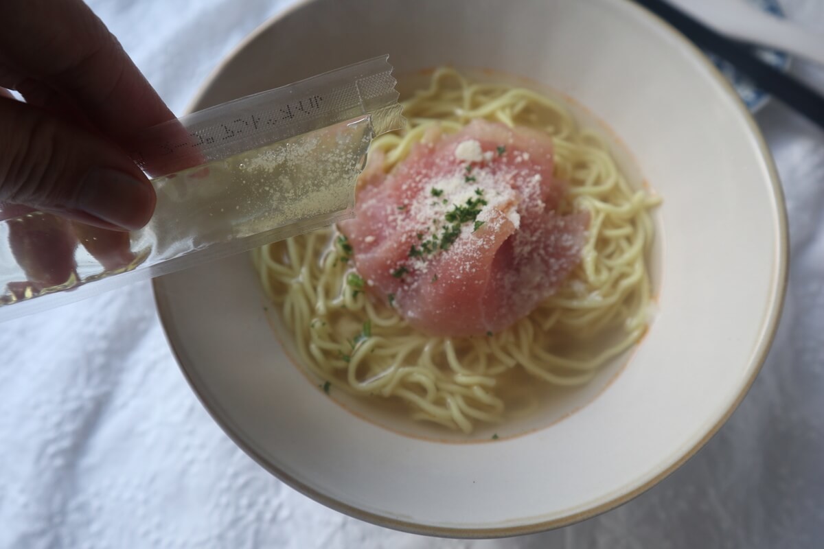 生ハムは、カルディの大人気の生ハム切り落としです。スープの熱でじんわりと熱が入っていき食感を楽しめます。粉チーズでコクもプラスされておすすめのトッピングです。
