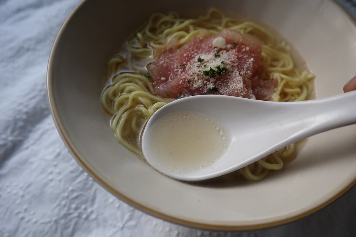 鶏塩ベースの澄んだスープですが、魚介や野菜の旨みもしっかりきいていて、深みのあるスープで淡白すぎずちょうどいいです。