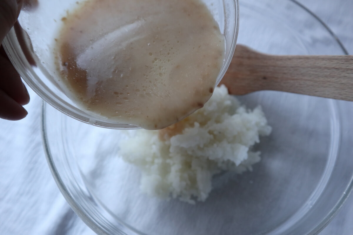 ごはん1膳に、温めたきのこクリームを加えて混ぜます。
