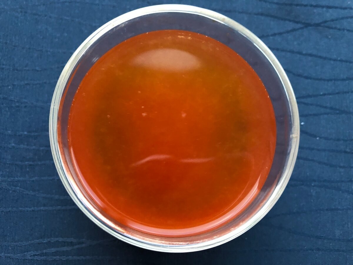 こちらが、「ストレートオレンジ」です。綺麗なオレンジ色。果肉感はゼロですが、絞ったあとの残り繊維のようなものがかすかに見られます。とはいえ、全体的にはサラサラな液体です。