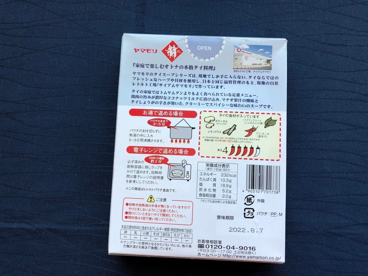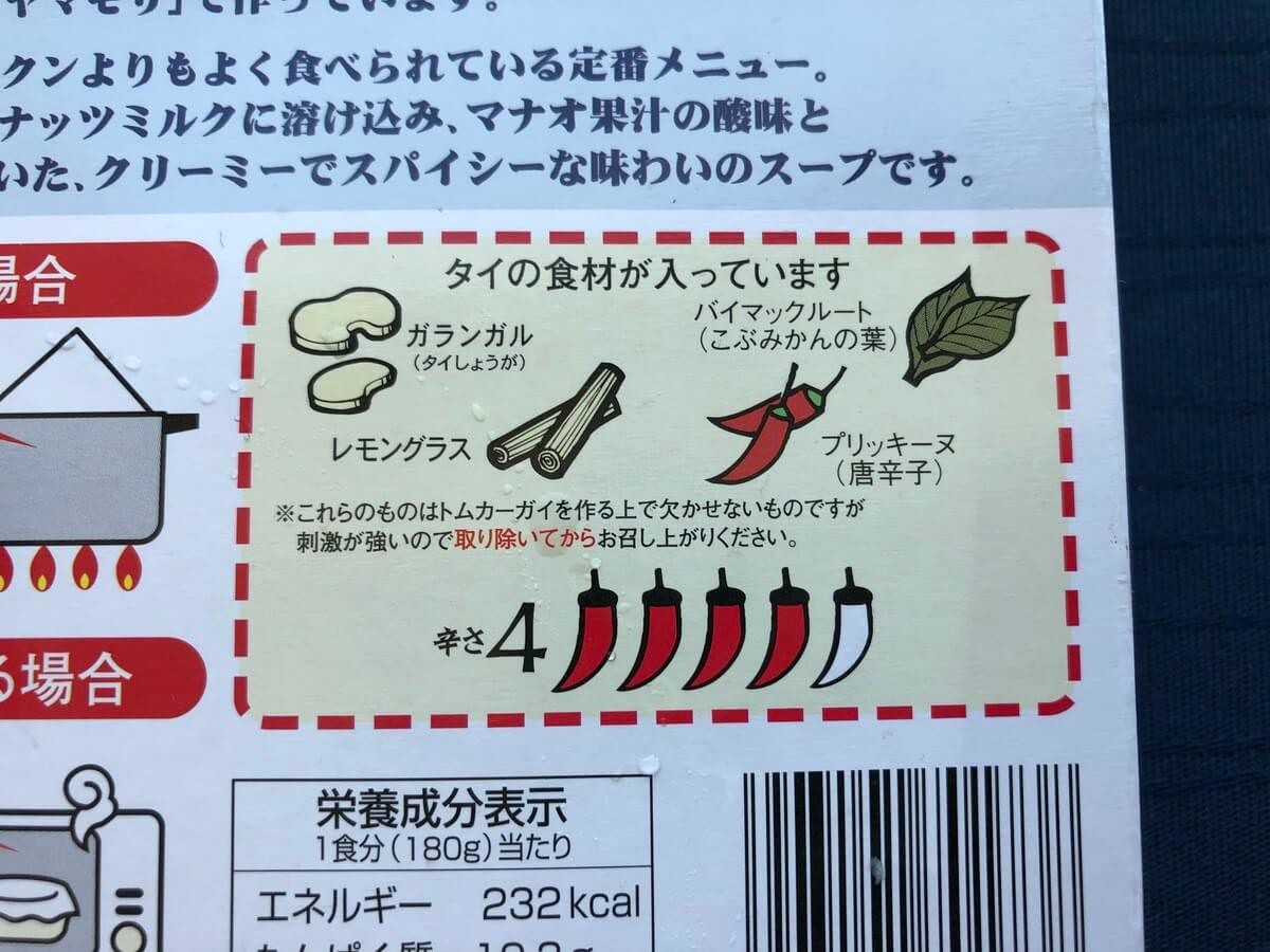 箱の表記にはちゃんとレモングラスやタイの生姜「カー」、こぶみかんの葉も入っていることが確認できます。なかなか本格的。これは期待できそうですね。