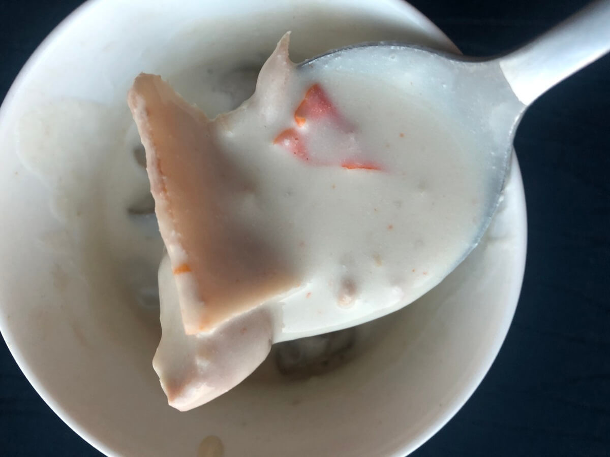 お湯で加熱することもできますが、電子レンジでチンしてもいいとのことなので、今回は手軽に電子レンジにしてみました。1分もせずに出来上がりです。