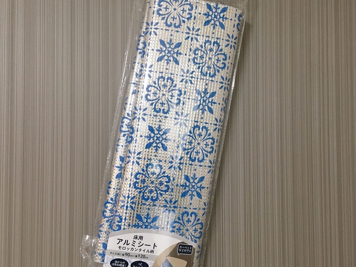 冷気対策に悩みつつも、コレ!と決めることが出来ずに今に至るのですが、スリーコインズで柄入りのアルミシートを発見して即購入しました。