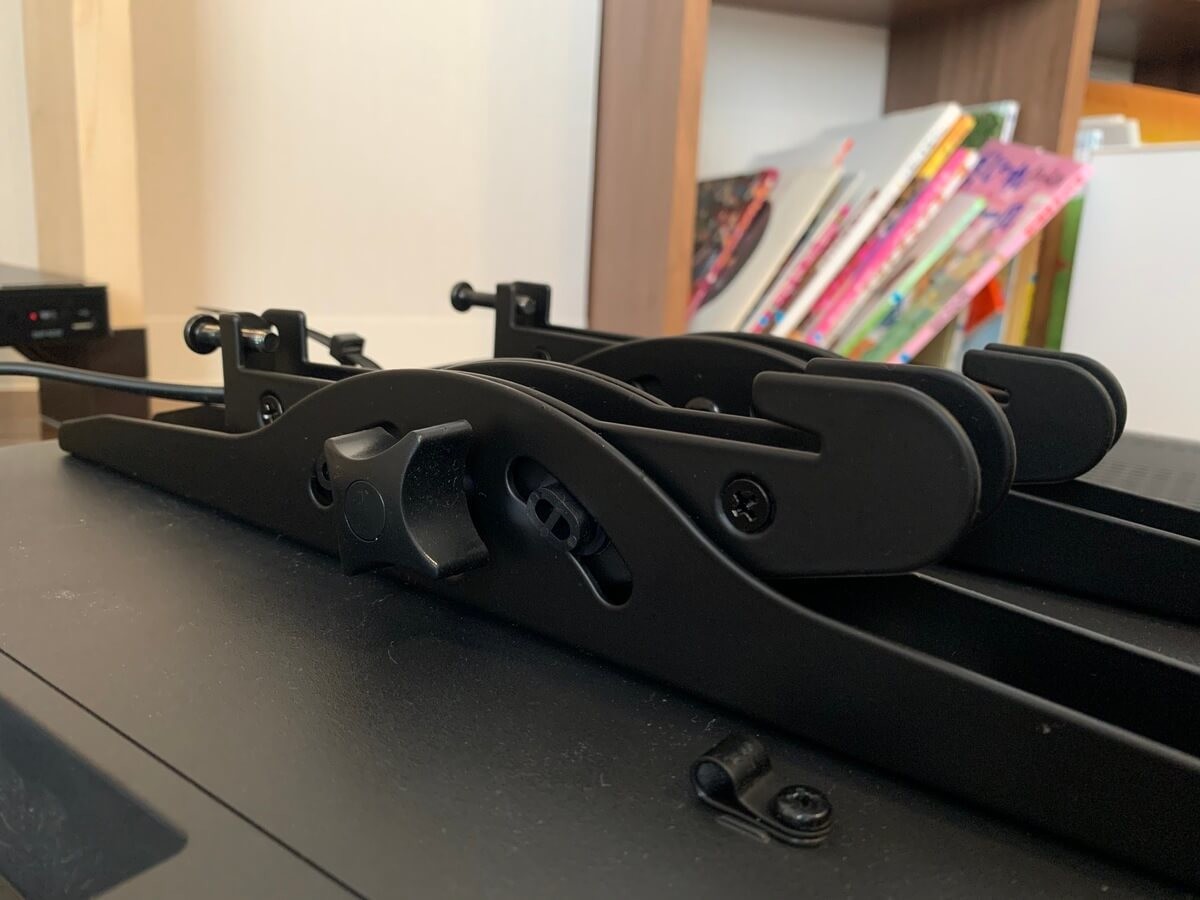このカギ爪のようになっている部分を柱側の金具にひっかけます。テレビをひっかけた後、下方についているネジで固定します。