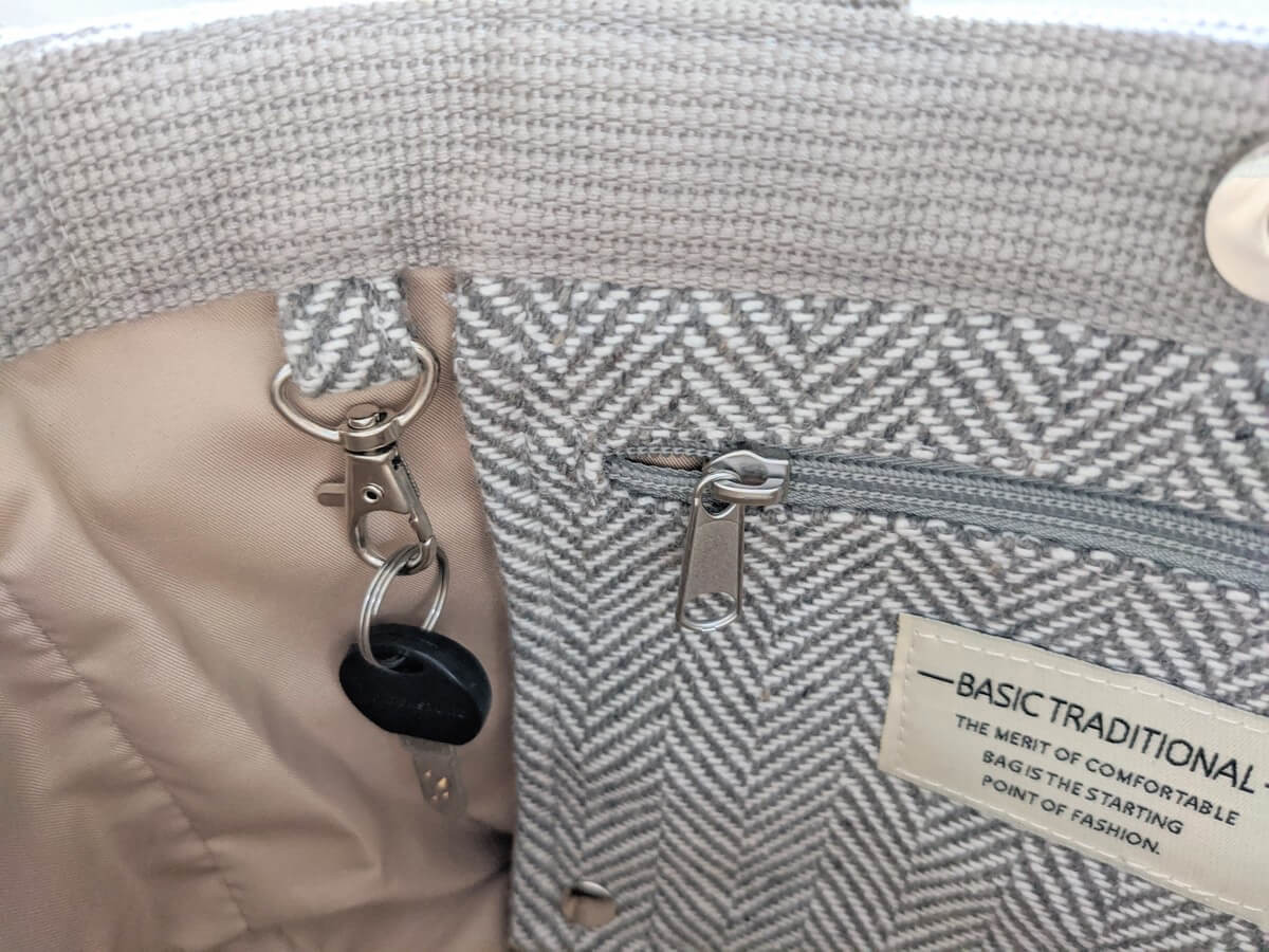 バッグの中には紛失しやすい鍵を付けておけるキーホルダーを装備。 私は主に自転車の鍵を付けていますが、このキーホルダーのおかげで探す手間がなくなりました♪