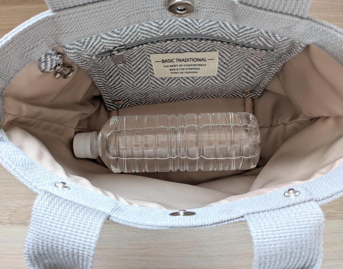 500mlのペットボトルを立たせても、バッグから飛び出さずにすっぽり収まってくれます。 思った以上にたくさん荷物が入るので助かります!