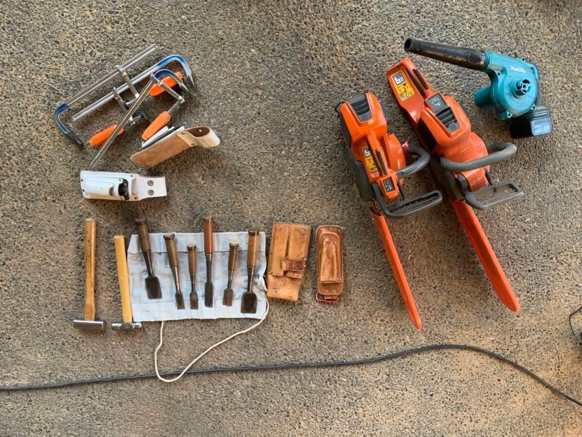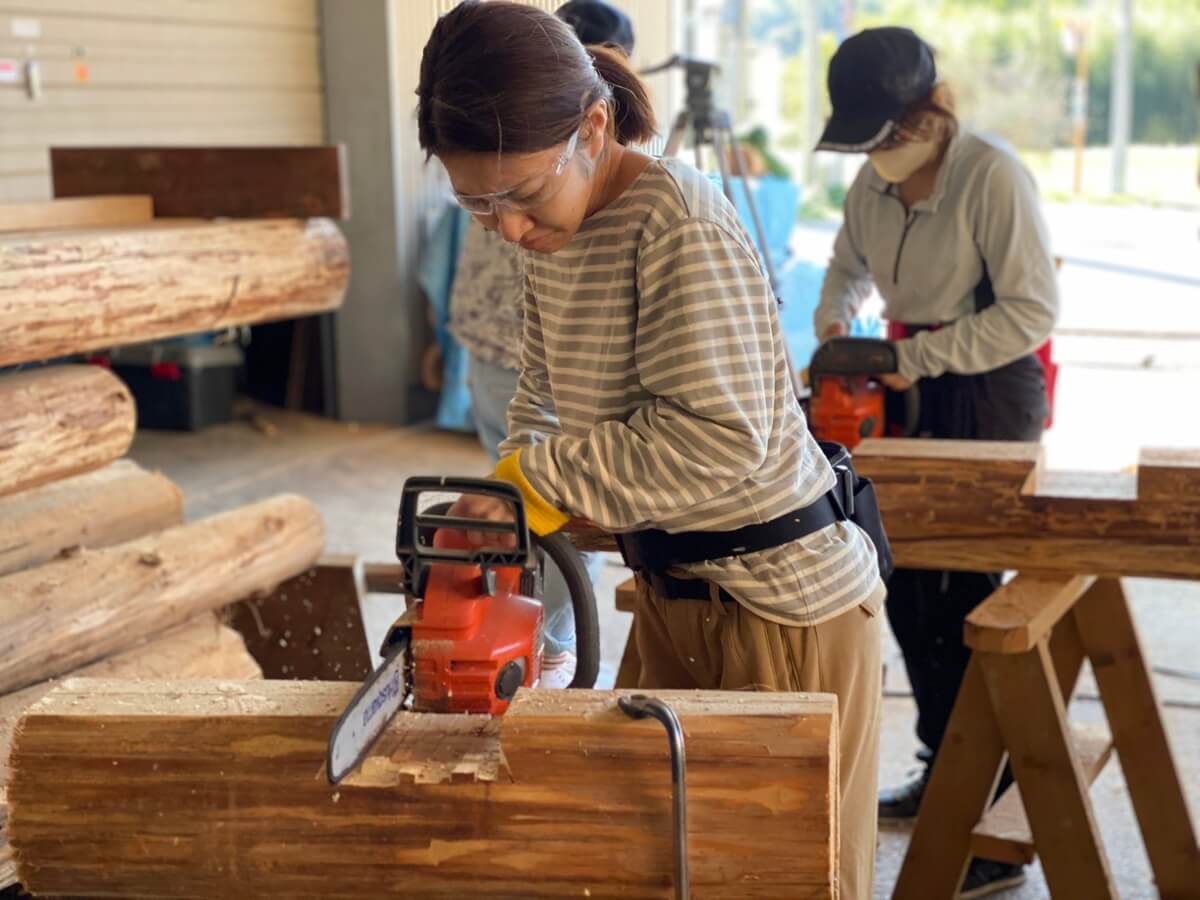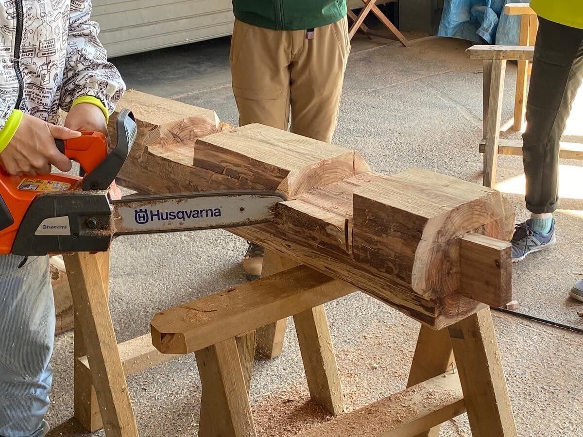 次にチェーンソーとノコギリを使って、側面の加工をしていきます。