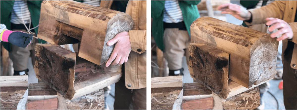 加工が終わったら、しっかり丸太同士が接合されるかどうかをチェックします。