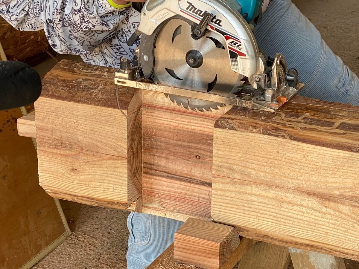 丸太の中で、切り落としてしまう部分は、まず丸のこで複数の切れ目を入れます。