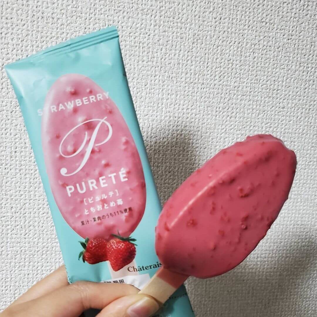 @hakuchi666akah2019さんのおすすめはピュルテのとちおとめ苺です。 ピンクの見た目がインパクト大の棒アイスです。北海道産生クリームととちおとめ苺の果汁を使用しています。 苺のフリーズドライも混ざっているのでカリっとした食感がアクセントに。