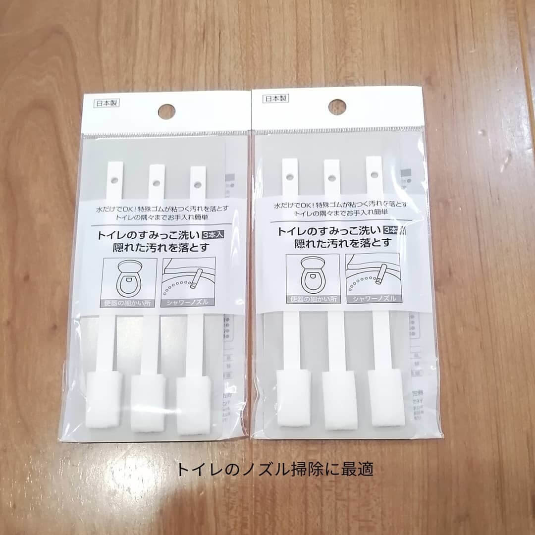 @rinrinhana12さんがセリアで購入した掃除アイテムはトイレのすみっこ洗い(使い捨て3本入り)。普段はサボりがちなシャワーノズルや便器の細かい部分の掃除に使うグッズです。