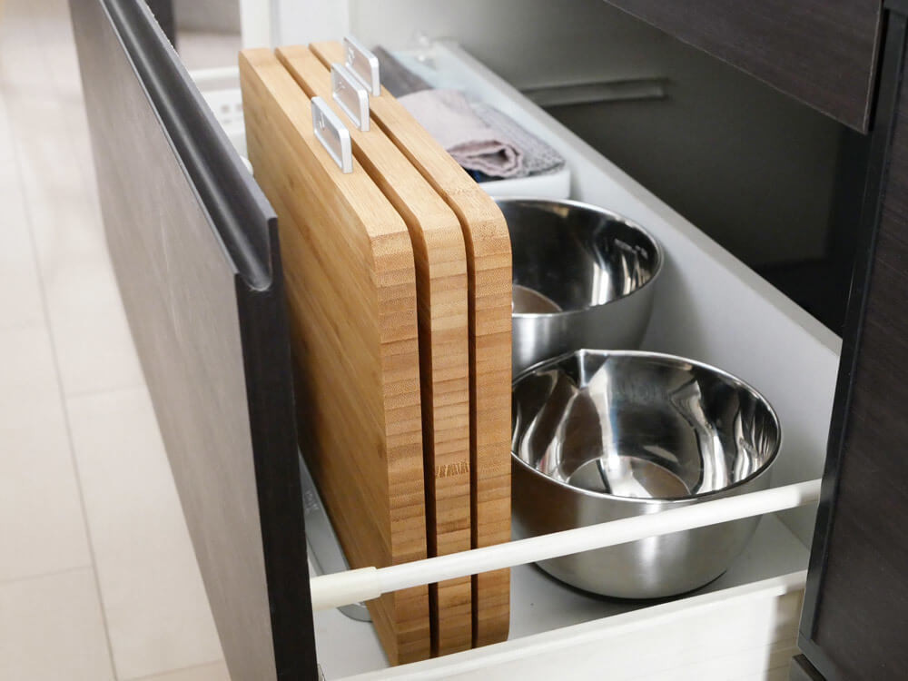 見せたくなるほどオシャレなまな板ですが、やっぱり作業台はスッキリさせたいという方には引き出し収納もおすすめ!