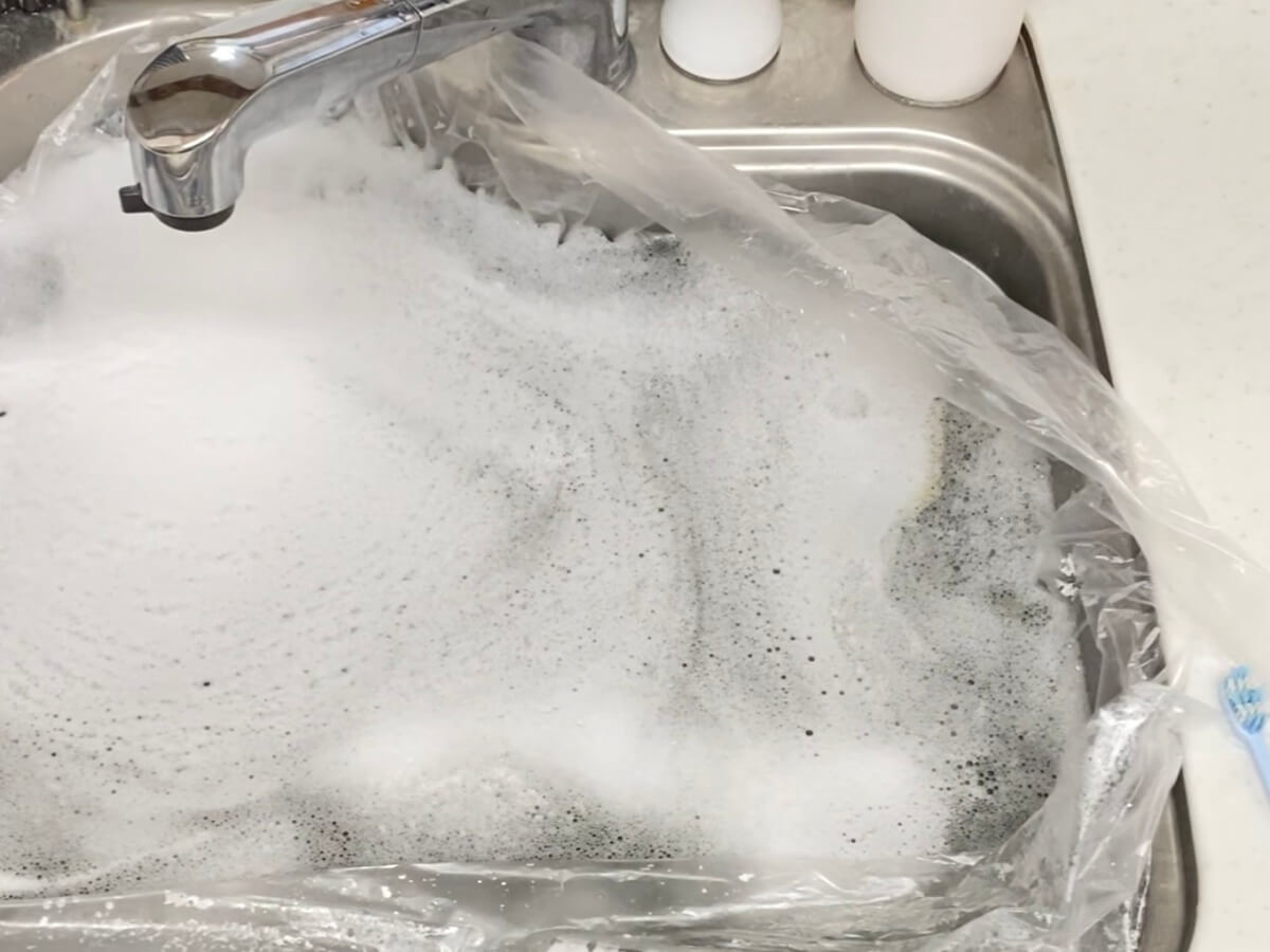 これをシンクに広げて、洗剤(私はオキシクリーンを愛用)と水を入れるだけで、すぐにつけ置き洗いができるんです。