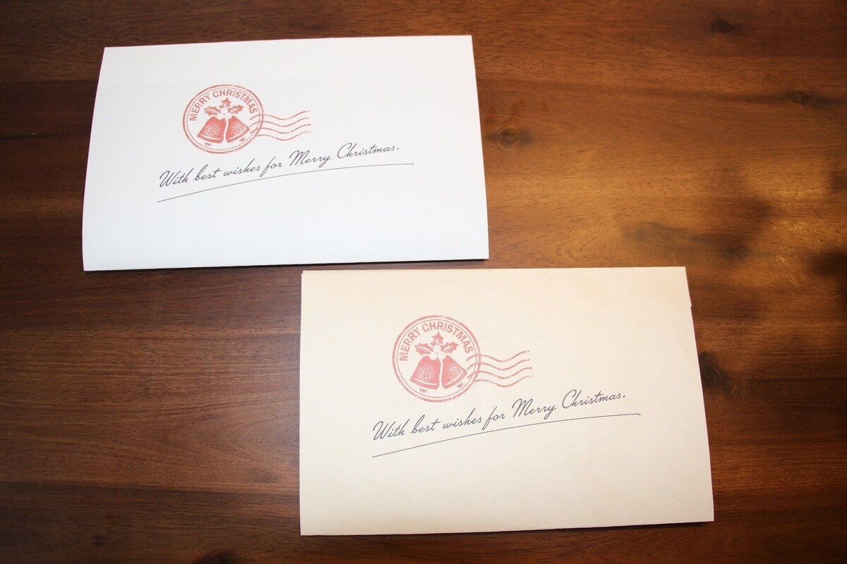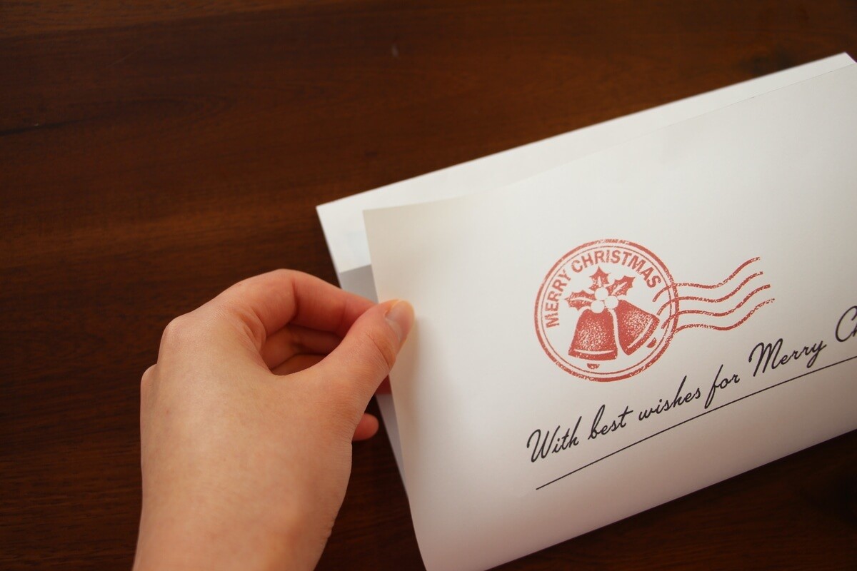 うら面はまるで、海外のグリーティングカードのよう!さらさらっと書かれたメッセージと、郵便のアンティークなスタンプがおしゃれです。
