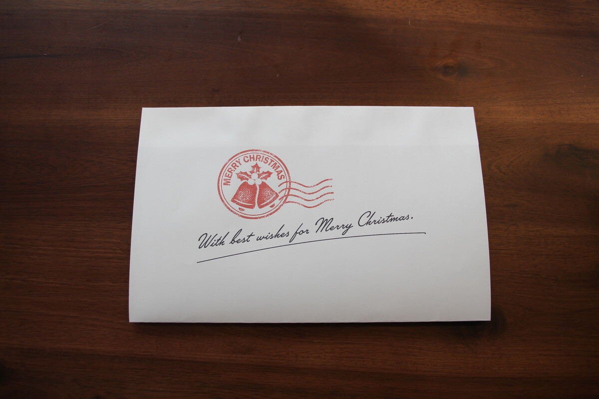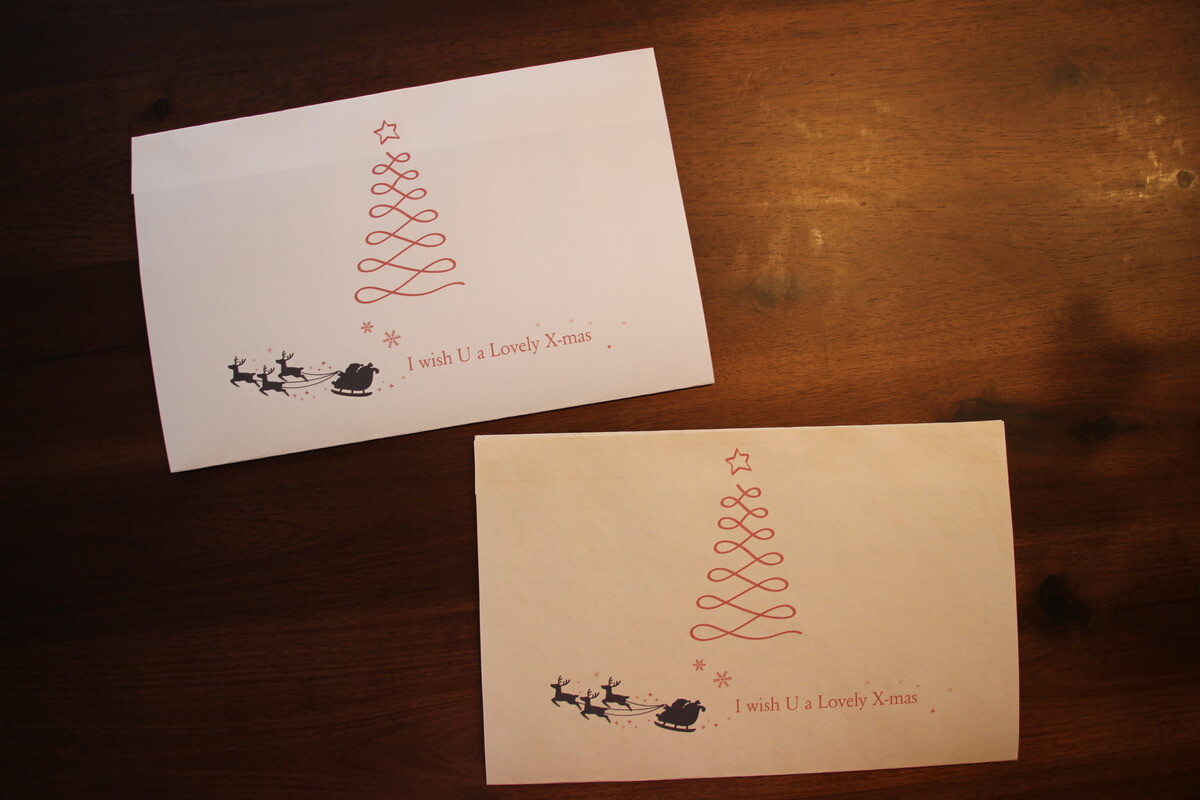おもて面は、大きな「Merry X-mas!(メリークリスマス)」の文字を、ツリーやベル、ろうそくなどがぐるりと取り囲み、とてもにぎやかなデザイン。見るだけでワクワクしてきますよね♪