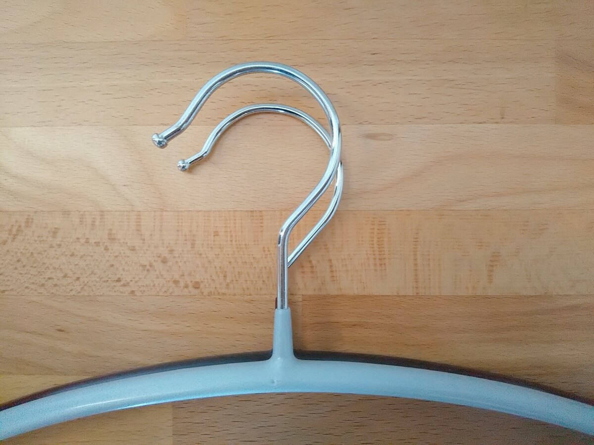 ちなみに、横幅が42cm以上もあると、首が詰まった洋服は襟元を引っ張ってかけることができません。無理に引っ張ると生地が傷むので、裾からハンガーを入れる必要があります。この点はちょっと面倒ですね。
