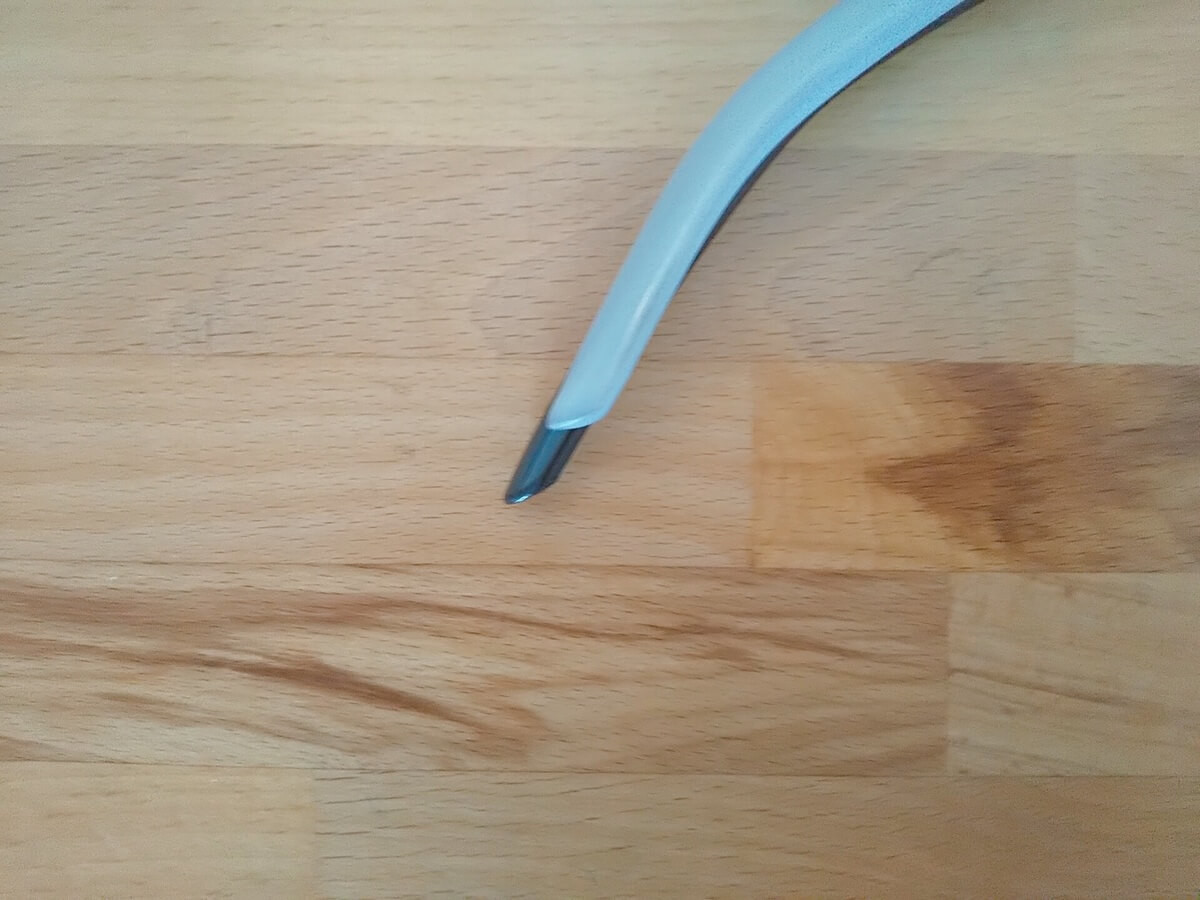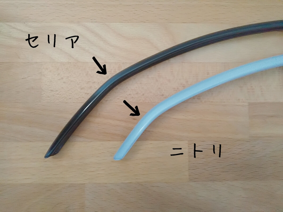 写真だと分かりにくいのですが、先端に近い場所でカクッと折れ曲がっているのがニトリ版。 セリア版は中央に近い場所で、ゆるい角度の“曲げ”が入っています。